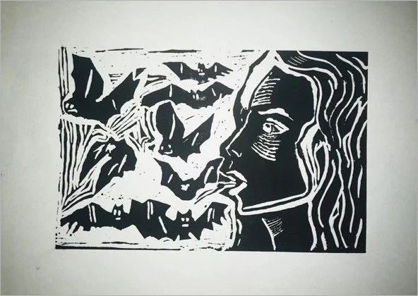 This painting depicts the alter-ego of a girl whose dark side emerges when she’s surrounded by people who constantly judge her on the basis of differences. The bats symbolize the harsh words that come out of her mouth to battle her critics. Dimensions: 11.9” x 16.2” Medium: Lino Cut Ink Painting Technique: Lino Cut Color palette: Black & White